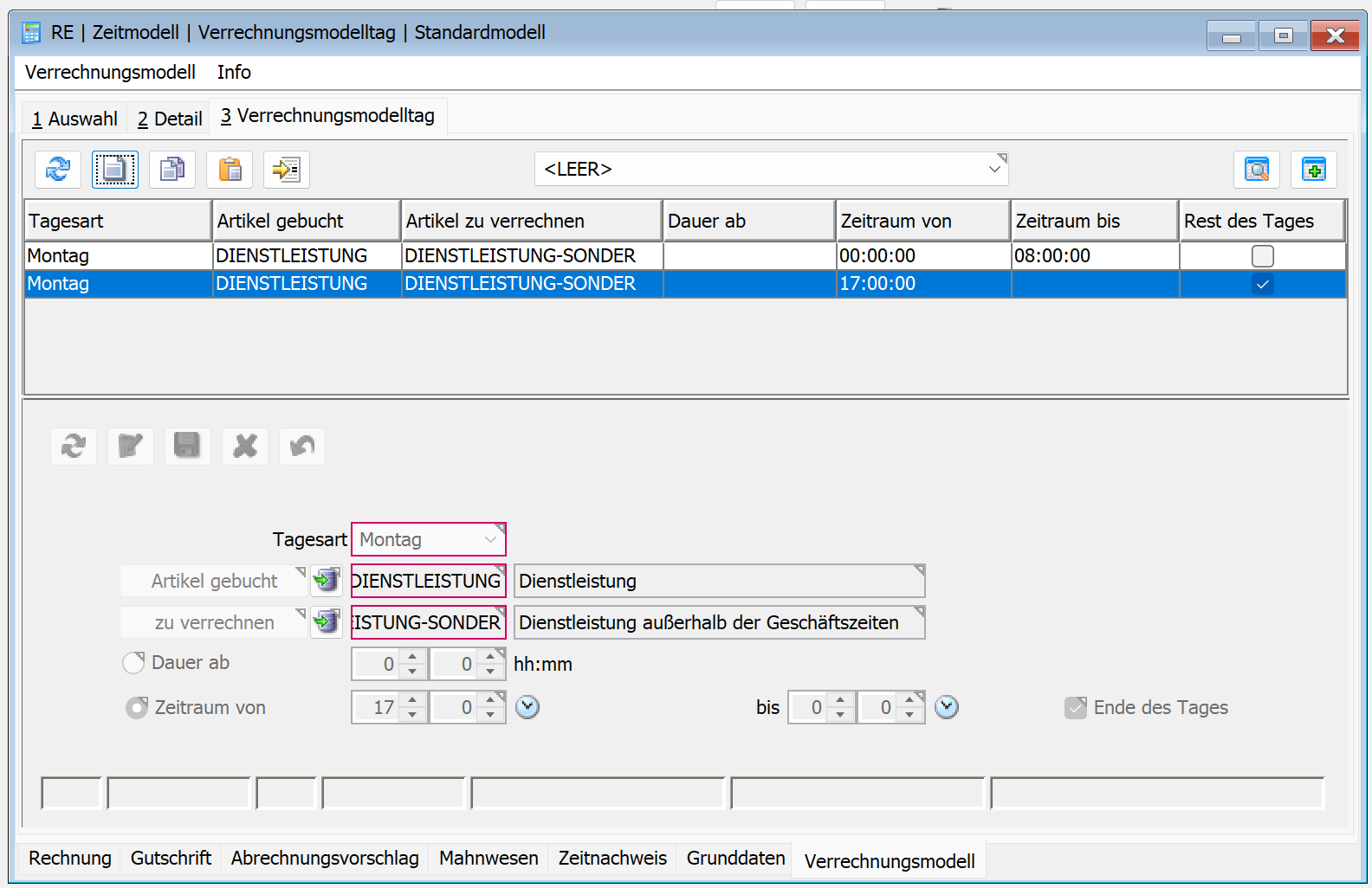 Gibt es über das Verrechnungsmodell anhand des Zeitpunkts eine Konfiguration, so überschreibt diese den Verrechnungsartikel und die Dauer.