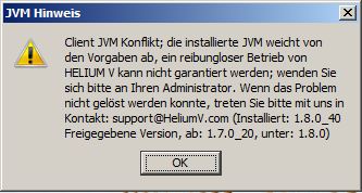 Bei der Anmeldung wird die Java-Version überprüft. Wenn die Java-Version Ihres Clients nicht den Anforderungen des HELIUM 5 Servers entspricht, erhalten Sie eine Meldung.