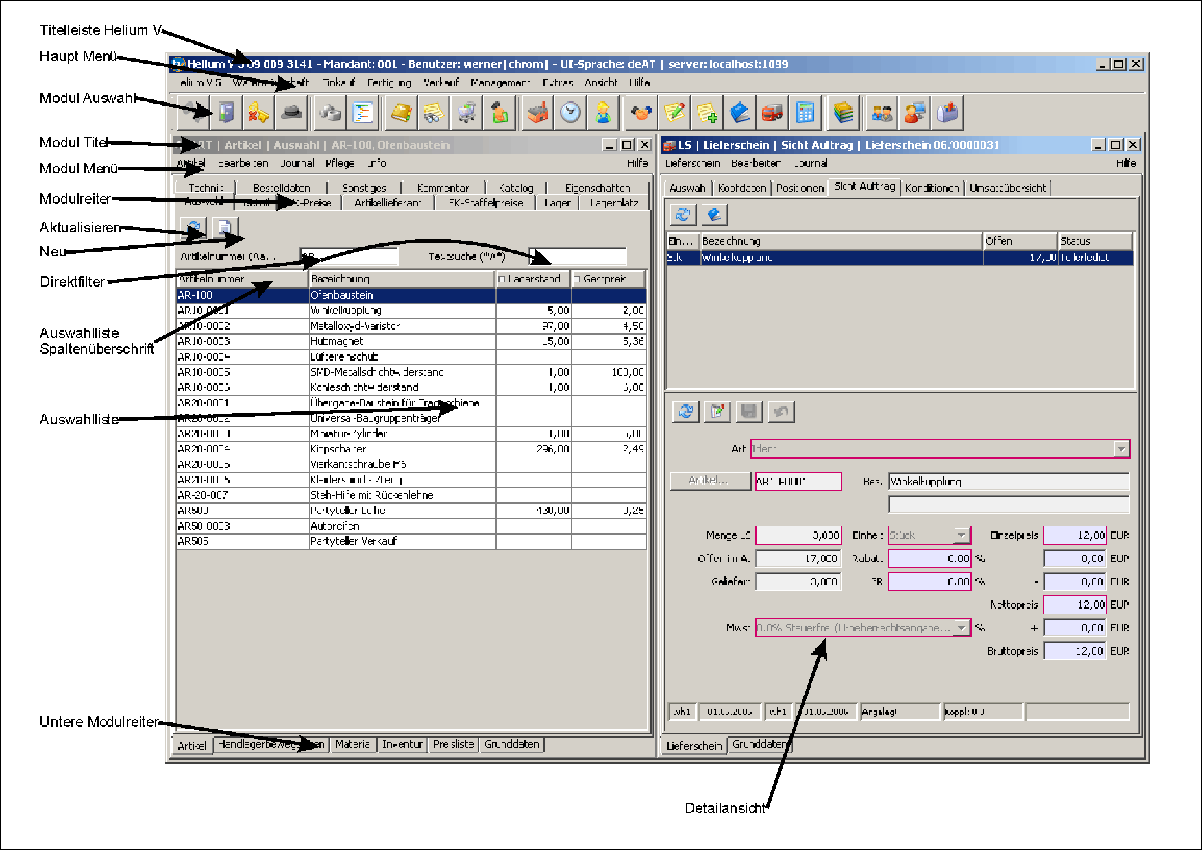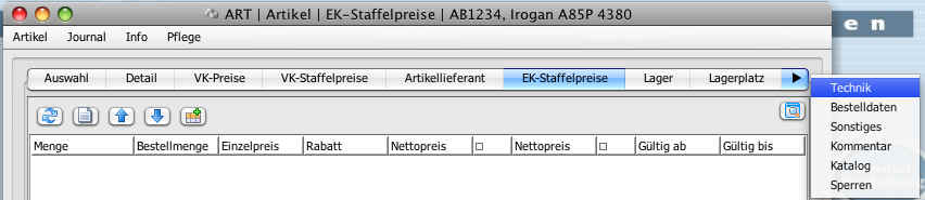 Die oberen Modulreiter dienen der Unterteilung der verschiedenen Sichten auf die Daten eines Moduls. Im Artikel z.B. auf die grundsätzlichen Kopfdaten (die Bezeichnungen) oder die Verkaufspreise usw.