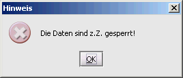 War beim Aufruf des Datensatzes dieser noch nicht gesperrt, wurde aber in der Zwischenzeit der Datensatz von einem anderen Benutzer gesperrt, so erscheint die Meldung: