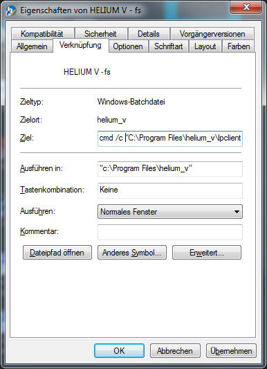 Klicken Sie dazu die HELIUM V Verknüpfung am Desktop mit der rechten Maustaste an und wählen Sie Eigenschaften. Nun ergänzen Sie vorne das Ziel um cmd /c.