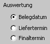 Vor der Auswertung muss die Auswertungsart definiert werden. Wählen Sie zwischen Belegdatum, Liefertermin und Finaltermin.