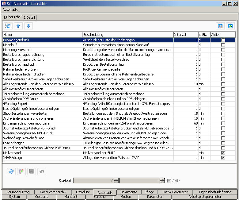 Die automatischen Aufträge starten zum unten angegebenen Zeitpunkt (Startzeit). Beachten Sie bitte dass diese Zeit den Startzeitpunkt der ersten Aufgabe bestimmt. Ist die erste aktive Aufgabe erledigt, wird mit der zweiten Aufgabe, die als aktiv gekennzeichnet ist, fortgefahren. Damit die Automatik überhaupt ausgeführt wird, muss im Reiter Übersicht zu jeder Aufgabe im unteren Detailfenster Aktiv angehakt sein.