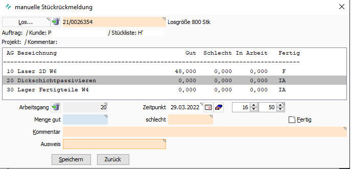 Sie finden im Modul Los, Menü, Bearbeiten, manuelle Stückrückmeldung. Mit Aufruf dies Menüpunktes erscheint der Erfassungsdialog.
