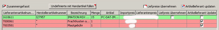 Durch Klick in die Haken "Liefpreise übernehmen" bzw. "Artikellieferant updaten" werden die Haken bei allen Positionen gesetzt bzw. entfernt. Positionen wie Frachtkosten und ähnliches definieren Sie z.B. als Handartikel. Ev. durch Klick auf Undefinierte mit Handartikel füllen.