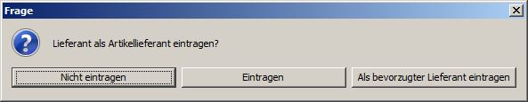 Soll der Artikel nun bei einem anderen Lieferanten bestellt werden, als in den Artikellieferanten hinterlegt, so verwenden Sie dazu das Icon Lieferant ändern und wählen den gewünschten Lieferanten aus der Liste aus. Nach der Auswahl erfolgt die Frage, ob Sie den Lieferanten in die Grunddaten des Artikels als Artikellieferant, oder sogar bevorzugten Lieferanten (Lief1) zurückpflegen wollen.