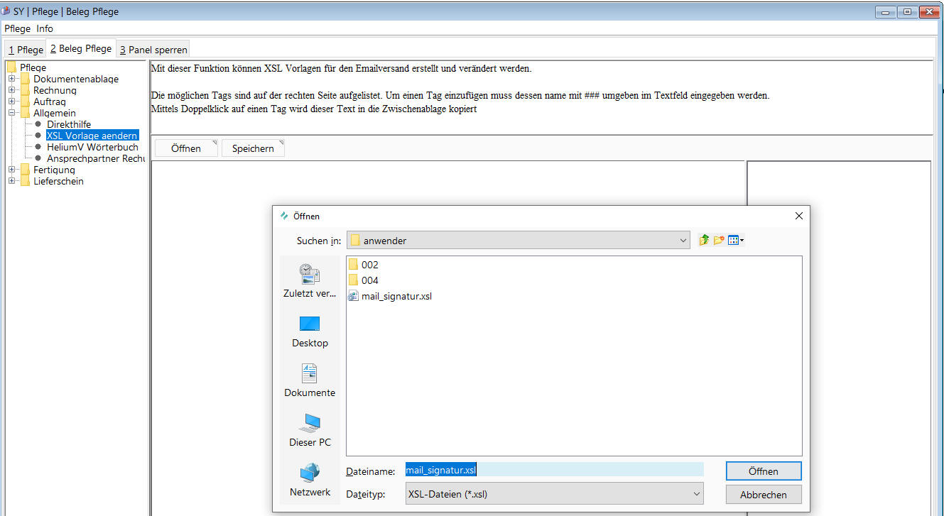 Um die Bearbeitung der HTML Vorlagen zu vereinfachen, haben wir einen in Ihrem HELIUM 5 Client integrierten Editor entwickelt. Idealerweise zeigt der Parameter auf eine öffentlich erreichbare Repräsentation Ihres Firmenlogos. Diesen finden Sie im Modul System, unterer Reiter Pflege, oberer Reiter Beleg Pflege und dann im Baum, Pflege, Allgemein, XSL Vorlage ändern. Durch Klick auf Öffnen wählen Sie die anzupassende XSL Vorlage aus. Nutzen Sie als Ausgangsbasis die im Verzeichnis allgemein mitgelieferte mail_signatur.xsl. Um dies möglichst allgemeingültig zu halten, wird auch der Firmenwortlaut übergeben. D.h. für eine gute Umsetzung müssen im Personal, im Reiter Daten folgende Werte eingetragen werden: