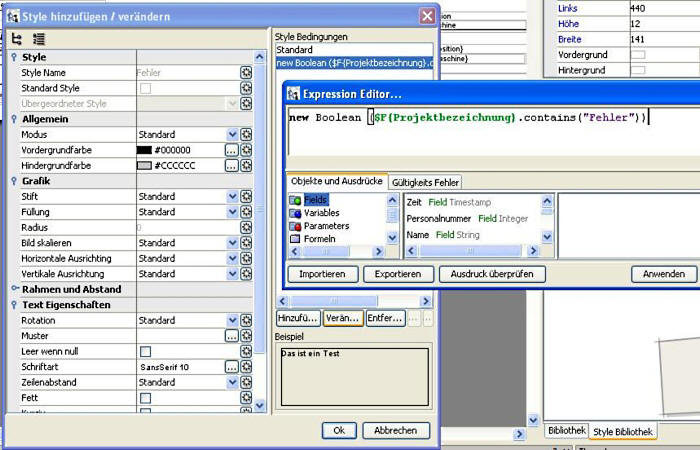 Sie können neue Styles über Style Bibliothek -> Neuer Style (Symbol) anlegen. Daraufhin öffnet sich ein Popup, in welchem der neue Style zu definieren ist. Bei Style Name ist ein Name für den aktuellen Style anzugeben, damit man beim Anlegen mehrerer Styles den Überblick behalten kann. Der Standardstyle beinhaltet alle Formatierungen, die ein Feld standardmäßig haben soll, z.B. schwarzer Vordergrund auf weißem Hintergrund. Mit dem Button 'Hinzufügen' kann man eine neue Bedingung erstellen, an welche andere Formatierungen geknüpft sind. Z.B. legt man als Bedingung new Boolean ($F{Projektbezeichnung}.contains("Fehler")) fest, was bedeutet, dass wenn in dem Feld 'Projektbezeichnung' das Wort 'Fehler' vorkommt, der definierte Style angewendet wird.