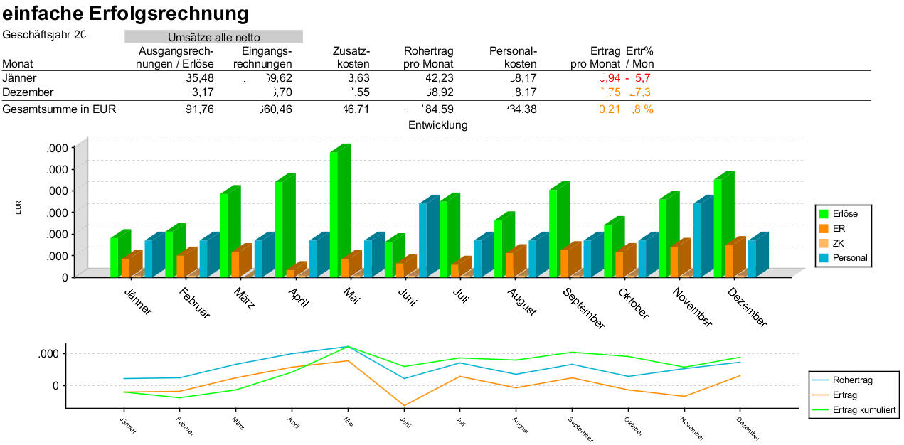 Aus Erlöse (Ausgangsrechnungen abzgl. Gutschriften) minus Aufwände ergibt sich der Rohertrag. Davon abgezogen werden die Personalkosten um den Ertrag pro Monat darzustellen. Mit der einfachen Erfolgsrechnung wird Ihnen eine grobe Näherung und Tendenz dargestellt.