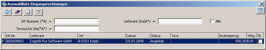 Wählen Sie die eine Eingangsrechnung mittels Doppelklick (oder Enter) aus oder legen Sie mit Neu eine neue Eingangsrechnung mit den aus der Bestellung übernehmbaren Daten an.