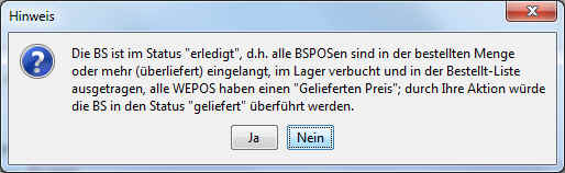 Die Meldung weist Sie darauf hin, dass der Bestellvorgang schon abgeschlossen ist. Wenn Sie die Bestellung manuell als erledigt markiert haben, müssen Sie dies eventuell nach der Erfassung der Transportkosten erneut tun. Bestätigen Sie die Meldung mit Ja, um die Transportkosten eingeben zu können.