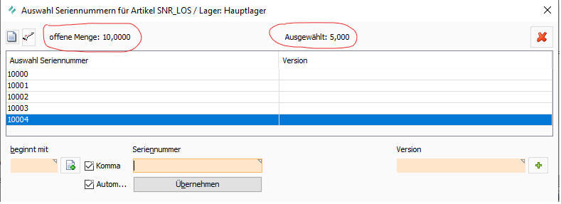 Bei der Losausgabe gibt es im SNR-Dialog einen Haken 'Automatik'. Wenn dieser angehakt ist, werden, wenn die ausgewählte Menge gleich der benötigten Menge ist, die Seriennummern automatisch übernommen. Zum Abschluss der Losausgabe wird der Fertigungsbegleitschein und daran anschließend die Ausgabeliste ausgedruckt.