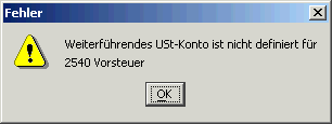 Die Meldung “Weiterführendes USt-Konto ist nicht definiert” bedeutet, dass in den Sachkonten das Konto fehlt, auf das die Ust/Vst gebucht werden soll.