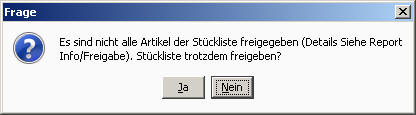 In aller Regel werden Sie dadurch die Stückliste nicht freigeben und mit dem Freigabe-Report (Info → Freigabe), bzw. der Sortierung nach dem Freigabestatus die entsprechenden Artikel freigeben. Wird die Freigabe eines Artikels zurückgenommen, so wird damit automatisch auch die Freigabe der Stückliste zurückgenommen. Gegebenenfalls erscheint die folgende Meldung.
