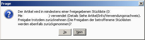 Mit der Rücknahme der Freigabe wird auch die Stücklisten, in der der Artikel verwendet wird, ihren Freigabestatus verlieren. Bitte beachten Sie, dass diese Funktion nicht rekursiv nach oben alle Freigaben auflöst.