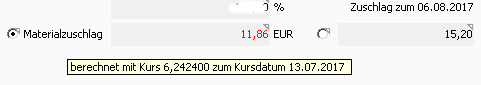 Um eventuelle Differenzen zwischen der Erfassung des Materialzuschlages und der aktuellen Berechnung darzustellen, wird im Preisdialog unten der gespeicherte und der aktuelle Zuschlagskurs angezeigt. Wählen Sie den gewünschten für Sie richtigen Kurs. Damit Sie bei einer eventuellen Kursabweichung erkennen können, warum dies so ist, wird bei Materialzuschlag ein Tooltip angezeigt, in dem die Ausgangsdaten dargestellt werden. Dies bedeutet, dass es durchaus vorkommen kann, dass auf einem Beleg gleiche Artikel mit unterschiedlicher Kursbasis (unterschiedlichem Bezugsdatum für die Kursberechnung) vorzufinden sind. Die Entscheidung ob dies richtig ist, liegt bei Ihnen.