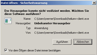Wählen Sie bitte den Windows-Download aus. Bestätigen Sie den Download durch Klick auf Speichern. Starten Sie nach Abschluss des Downloads die heruntergeladene heliumv-client.exe, bestätigen Sie bei Bedarf mit Ausführen. Folgen Sie der Menüführung.