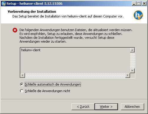 Sollte die folgende Meldung erscheinen, so wählen Sie bitte Schließe automatisch die Anwendungen.