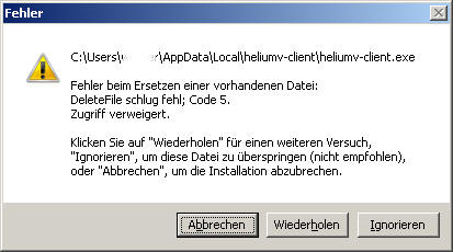 Du hast nicht die benötigten Zugriffsrechte, um das Programm “heliumv-client” zu öffnen.