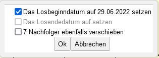 Nach dem Verschieben erscheint in der Regel ein Fenster. Damit kann definiert werden, wie die Nachfolger mitverschoben werden sollen. Um die nach dem soeben verschobenen Arbeitsgang gereihten Arbeitsgänge dieses Loses seriell hinter dem soeben verschobenen Arbeitsgang einzureihen, haken Sie bitte Nachfolger ebenfalls verschieben an. Ist der Arbeitsgang der letzte Arbeitsgang des Loses, kann das Losendedatum auf das geplante Ende des Arbeitsganges gesetzt werden. Dafür haken Sie Das Losendedatum setzen an. Ist der Arbeitsgang der erste Arbeitsgang des Loses, kann das Losbeginndatum auf den geplanten Beginn des Arbeitsganges gesetzt werden. Dafür haken Sie Das Losbeginndatum setzen an.