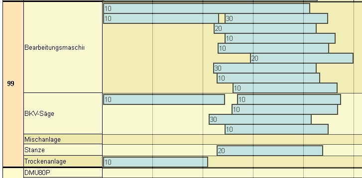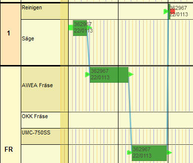 Werden Arbeitsgänge nicht wie geplant erledigt, sondern zu spät, so sieht man, dass Arbeitsgänge hängen bleiben. Das bewirkt wiederum, dass sich die Höhe der Maschinenzeile verändert und erhöht. Es wird sichtbar, dass es hier zu zeitlichen Überschneidungen kommt. Zusätzlich werden Arbeitsgänge, die vor dem aktuellen Tag bereits erledigt werden hätten sollen, in hellblau dargestellt.