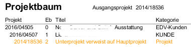 Der Projektbaum, in dem sich das jeweilige Projekt befindet, kann im Reiter Verknüpfung durch Klick auf das Druckersymbol dargestellt werden. Das Ausgangsprojekt des Projektbaumes ist in der Baumstruktur farblich hervorgehoben.