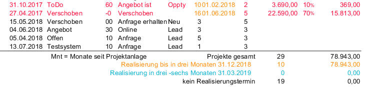 Mit dem Journal Projektforecast erhalten Sie eine Übersicht über alle offenen Projekte zum Stichtag mit den Umsätzen und Wahrscheinlichkeiten und einer daraus berechneten Prognose, welche Umsätze Sie voraussichtlich in den nächsten drei bzw. sechs Monate ab dem Stichtag machen werden.