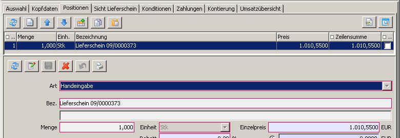 Die Änderung der gelieferten Mengen ist nicht zulässig. Sollte dies erforderlich sein, so muss der Lieferschein vor der Einbindung in die Rechnung abgeändert werden.