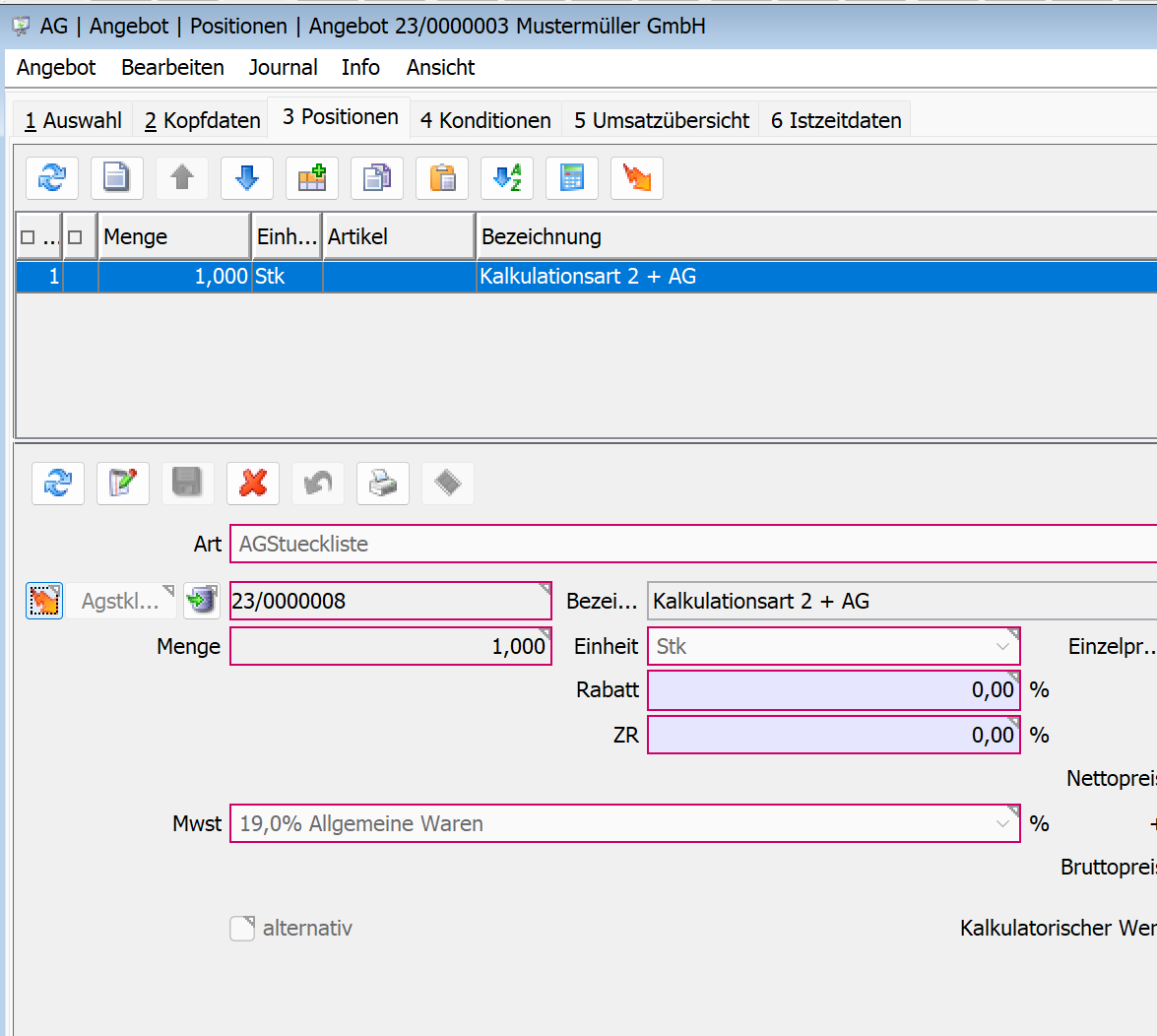 Dieser Abschnitt gilt ausschließlich für die Kalkulationsart 2. Information zu den Kalkulationsarten 1 und 3 finden Sie unter Klassische Angebotsstückliste.