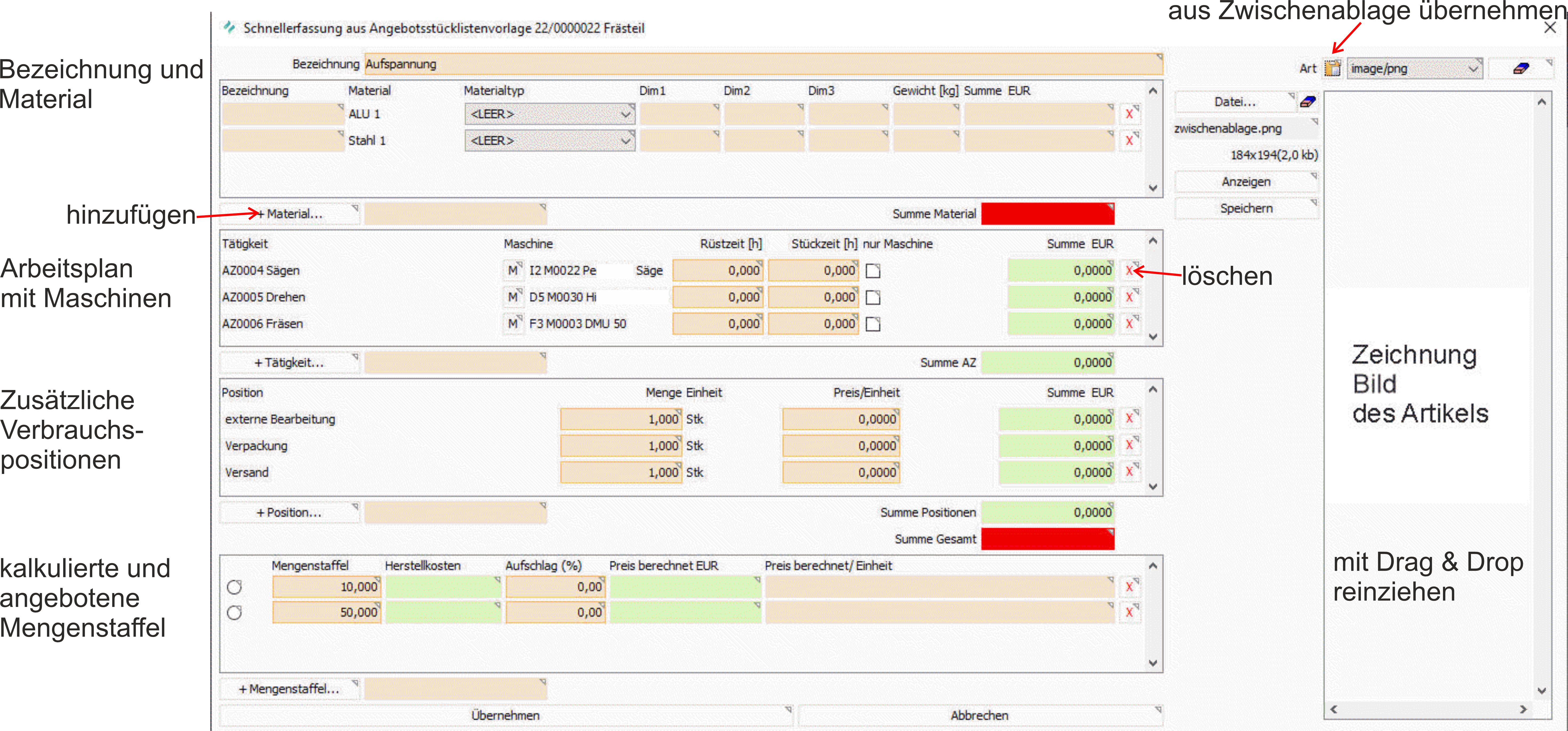 Mit der Schnellerfassung der Angebotsstückliste steht Ihnen ein Werkzeug für eine rasche Kalkulation von neuen Produkten zur Verfügung. Die Schnellerfassung wird vor allem in Metallverarbeitungsbetrieben eingesetzt. Anhand von vorab definierten Vorlagen können Sie sehr schnell ein Angebot für eine Sonderanfertigung kalkulieren.