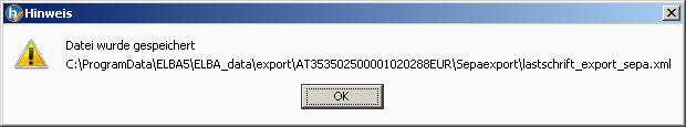Beim Export der Lastschriften werden die Daten überprüft und bei fehlenden Daten die entsprechenden Fehlermeldungen ausgegeben. Bitte handeln Sie entsprechend. Konnte der Export erfolgreich durchgeführt werden, so erscheint die Meldung wohin die Datei gespeichert wurde.