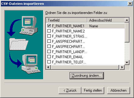 Ordnen Sie nun die Felder zu. D.h. es muss nun die Übersetzung der Feldnamen aus HELIUM V, genauer aus der Exportdatei der Empfängerliste bzw. den von Ihnen in der Tabellenkalkulation benannten Spaltenüberschriften auf die Felder in Outlook durchgeführt werden.