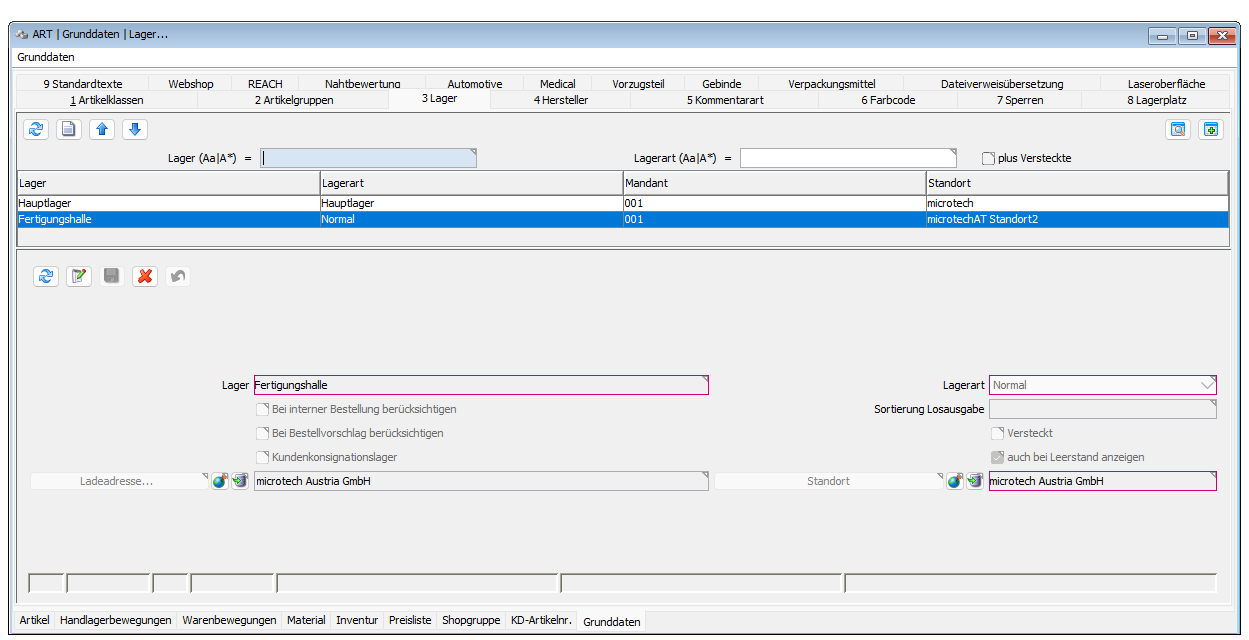Navigieren Sie ins Modul Artikel → unterer Reiter Grunddaten → oberer Reiter Lager. Legen Sie pro Standort ein eigenes Lager an und vergeben Sie die Standortadresse.