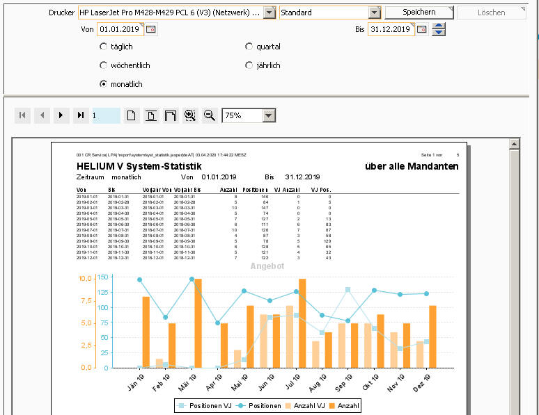 Die Auswertung zählt Belege und Belegpositionen im angegebenen Zeitraum und vergleicht sie mit demselben Zeitraum im Vorjahr. Die Belege und Positionen werden übergreifend über alle Mandanten gezählt. In der Auswertung sehen Sie die Anzahl aufgeteilt in die Belegarten.