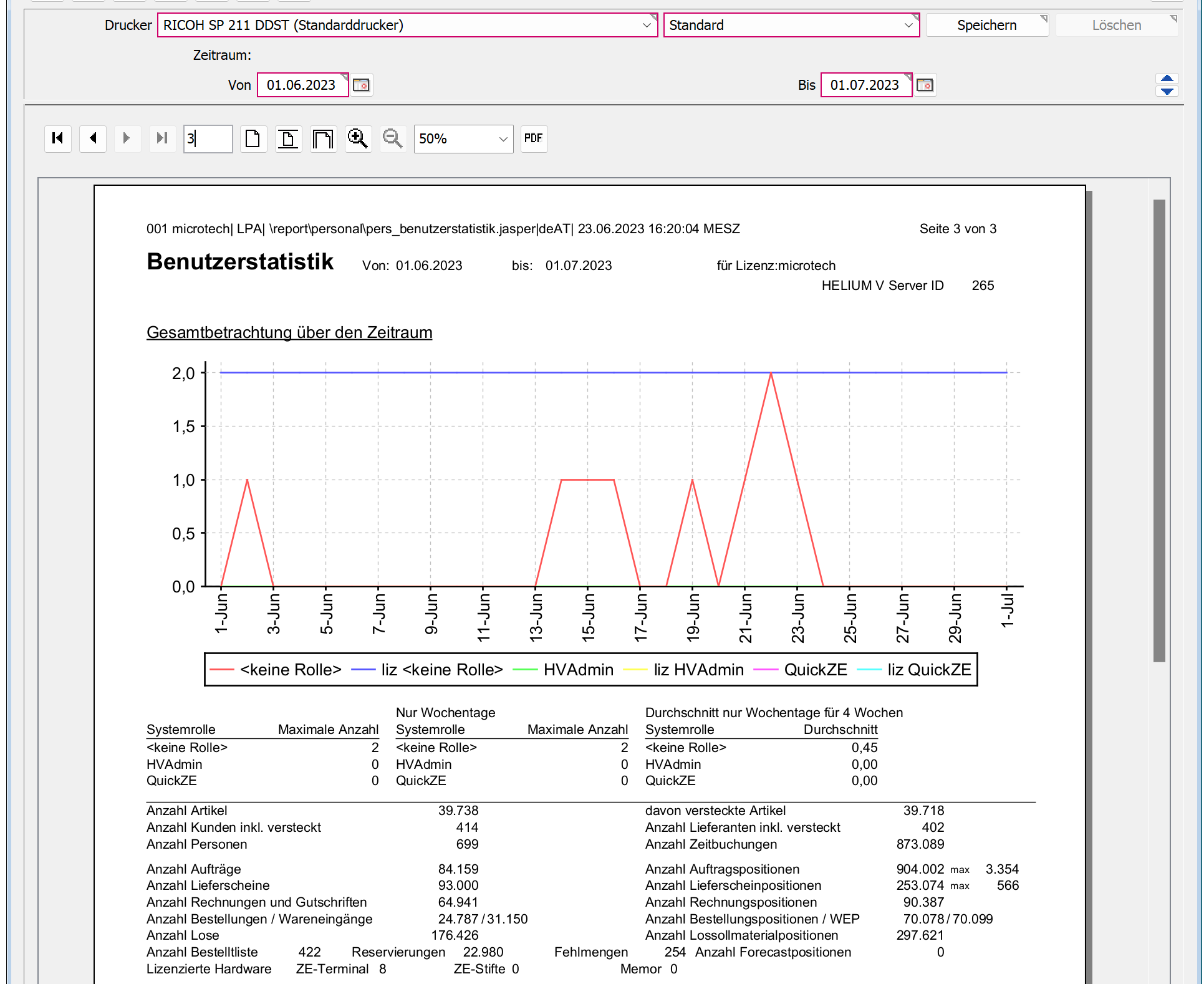 Um Ihr Lizenzvolumen einschätzen zu können, steht Ihnen im Modul System eine Auswertung der Nutzung zur Verfügung. Zur Auswertung gelangen Sie über das Modul System → unterer Reiter Gesperrt → oberer Reiter Logged In → Drucker-Icon.