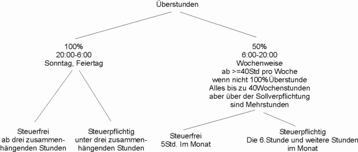 Überstunden 100% | steuerfrei | Tagesbetrachtung | Stunden im Zeitraum zwischen 20:00 und 6:00 oder an Sonn- und Feiertagen. Ab drei zusammenhängenden Überstunden sind diese steuerfrei. |