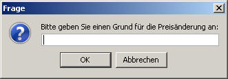 Schalten Sie dazu den Parameter BEGRUENDUNG_BEI_VKPREISAENDERUNG auf 1. Damit wird bei jeder Preisänderung eine entsprechende Begründung abgefragt.
