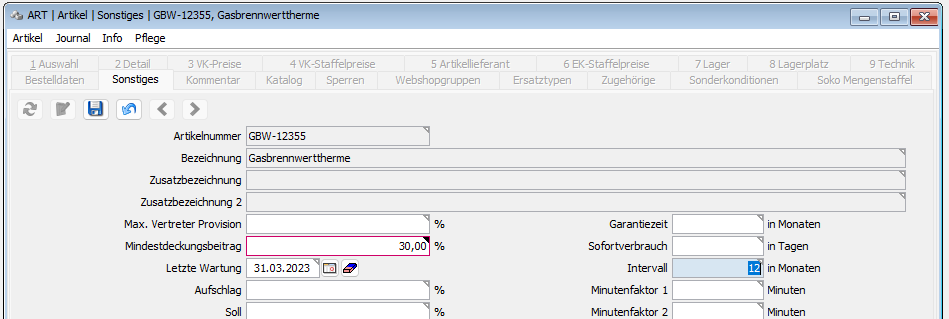 Legen Sie für die Wartung des Geräts bei diesem Kunden einen neuen Artikel an und setzen Sie im Artikelreiter Sonstiges die letzte Wartung auf den Ausliefertermin und das Wartungsintervall auf die Monate bis zur nächsten Wartung.