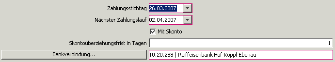 Mit dem Parameter ZAHLUNGSVORSCHLAG_SKONTOUEBERZIEHUNGSFRIST können Sie einstellen, wie lange Skonto noch berücksichtig werden soll (Eingabe in Tagen).
