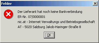 Für ausländische Lieferanten mit inländische Bankverbindungen ist der Ort der Bank wesentlich. Sie erhalten obige Fehlermeldung auch, wenn zwar eine Bankverbindung angegeben ist, aber der Ort der Bank fehlt und daher nicht festgestellt werden kann, ob es sich um eine inländische oder eine ausländische Bank handelt.