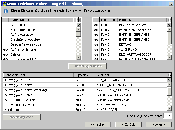 Nach der Definition der Trennzeichen gelangen Sie in die Feldzuordnung. Klicken Sie hier zuerst in das linke Fenster, danach in das dazu passende Importfeld des rechten Fensters und dann auf Zuordnung erstellen. Definieren Sie alle Felder, sodass Sie im Endeffekt im unteren Fenster folgende Definition erhalten.