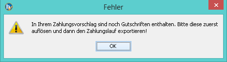 Gutschriften werden nicht exportiert, genauer offene negative Beträge werden nicht exportiert. Sollten Sie versehentlich einen Zahlungsvorschlag mit einem negativen Betrag eingetragen haben, so erscheint beim Exportieren des Zahlungsvorschlages die Fehlermeldung “Gutschriften enthalten”. Zusätzlich werden die Zeilen mit negativen Beträgen in Rot angezeigt.