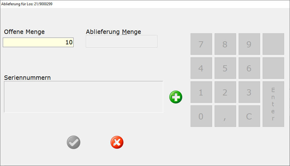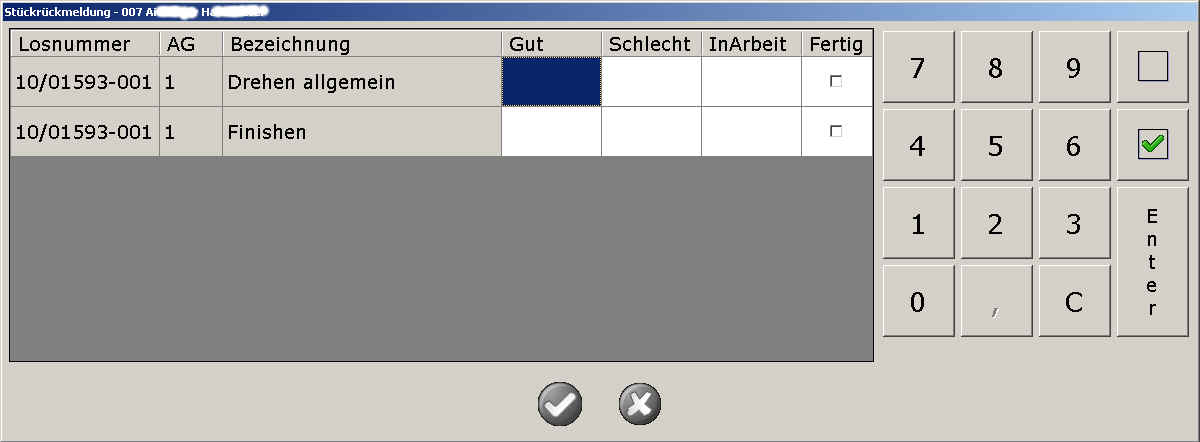 Die Bedienung ist so, dass Sie die Ziffern mittels Nummernblick eintippen und danach auf Enter tippen. Damit springt die Erfassung in das nächste Feld. Geben Sie auch bei Schlecht eine Stückzahl ein, eventuell 0, dann mit Enter weiter zu In Arbeit. Auch hier muss die Menge eingegeben werden. Nun haken Sie gegebenenfalls den Fertig Status des Arbeitsgangs durch Tipp auf den Haken an. Damit ist die eine Erfassungszeile abgeschlossen und die Eingabemaske wird auf die nächste Zeile gestellt. Sind alle Felder erfasst, so kann durch Tipp auf den nun grünen Haken dies bestätigt werden.