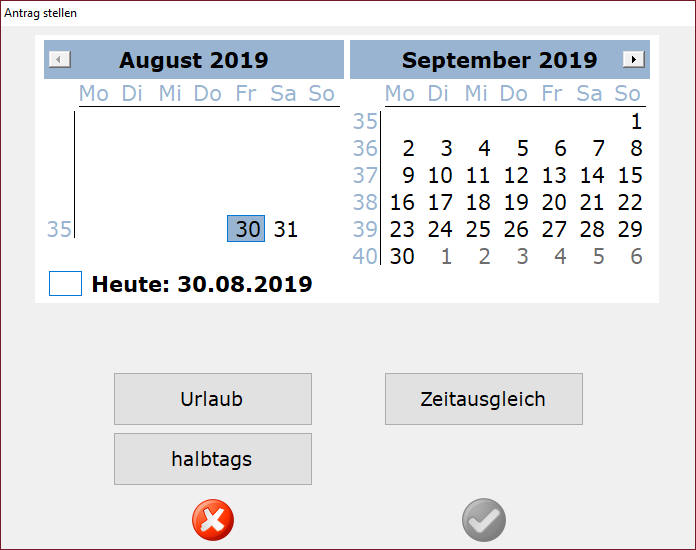 Setzen Sie den Haken bei Urlaubsantrag, wenn im Hauptfenster ein Icon für einen Urlaubsantrag angezeigt werden soll. Wenn Sie auf das Icon für den Urlaubsantrag klicken, wird ein Dialog für die Beantragung von Urlaub oder Zeitausgleich geöffnet.