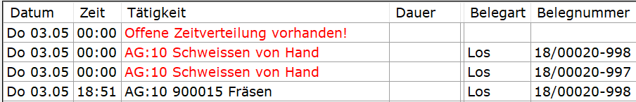 Aus Geschwindigkeitsgründen werden immer nur die 200 ältesten Arbeitsgänge angezeigt. Da dies auch abhängig von der Einschränkung nach Maschine bzw. Maschinengruppe ist, wird unter Umständen eine andere Anzahl von Arbeitsgängen angezeigt. Zusätzlich greift hier noch der Parameter ZEITVERTEILUNG_TYP. D.h. bei Typ = 2 werden gegebenenfalls nur der Rüst- und der erste Umspann-Arbeitsgang je Arbeitsgang angezeigt. Bitte achten Sie auf eine realistische Zeitplanung Ihrer Lose und Arbeitsgänge, bzw. aktivieren Sie dafür im Reiter HeliumV -2 die Maschinengruppe bzw. die Maschinenidentifikation.