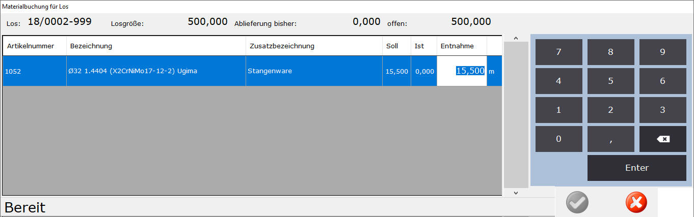 Mit Material starten Sie die Materialentnahmebuchung auf das Los durch tipp auf
