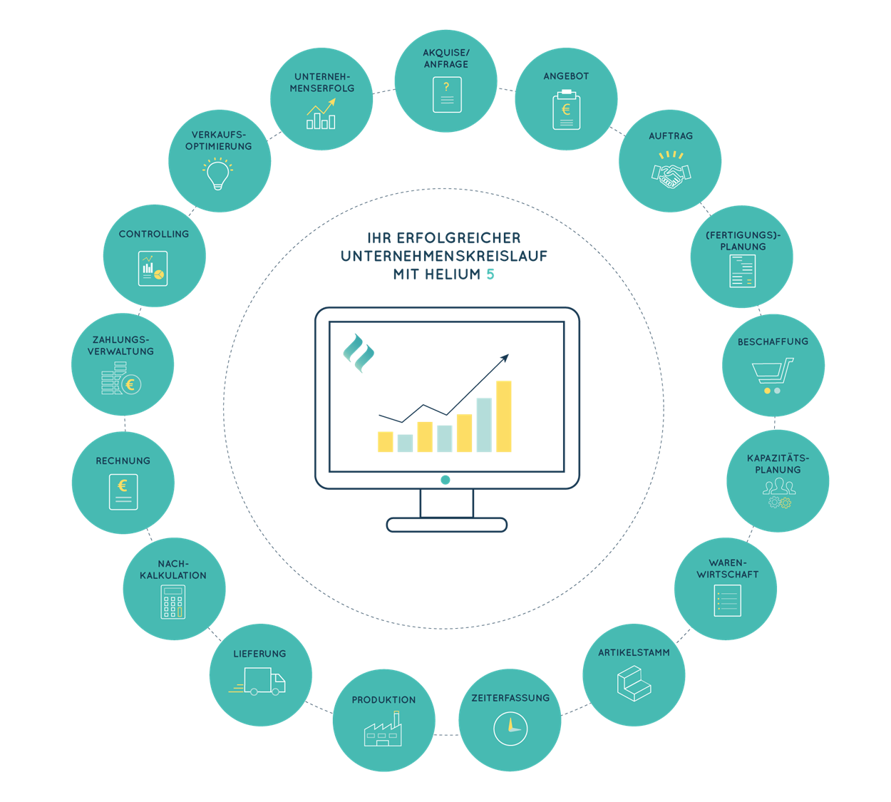 Zusätzlich erreicht man damit, dass man eine Aussage über die Vergangenheit, in der Regel in den Statistiken und eine Aussage über die Zukunft (Bewegungsvorschau, offene Aufträge, ..) bekommt. D.h. einfach nur durch das systemkonforme Verwenden werden neben her eine Menge an weiteren Unternehmensinformationen zur Verfügung gestellt, welche für die Steuerung des Unternehmens wichtig sind. Anmerkung: Solche Daten kann per Definition ein reines Buchhaltungsprogramm nicht liefern, Sie benötigen dafür ein vollständiges und umfassendes ERP System, wie HELIUM V.